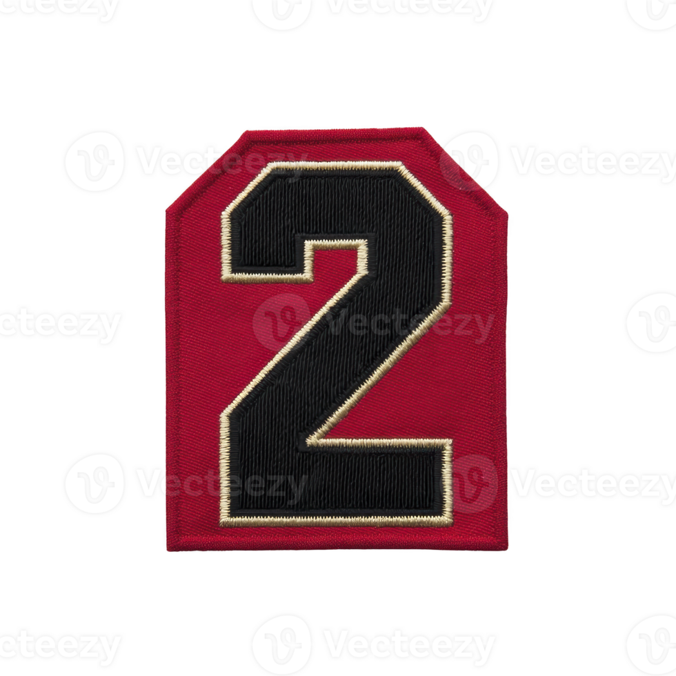 Red fabric patch with bold black number two outlined in gold stitching, set against plain background. patch has rectangular shape with slightly rounded corners Pro PNG