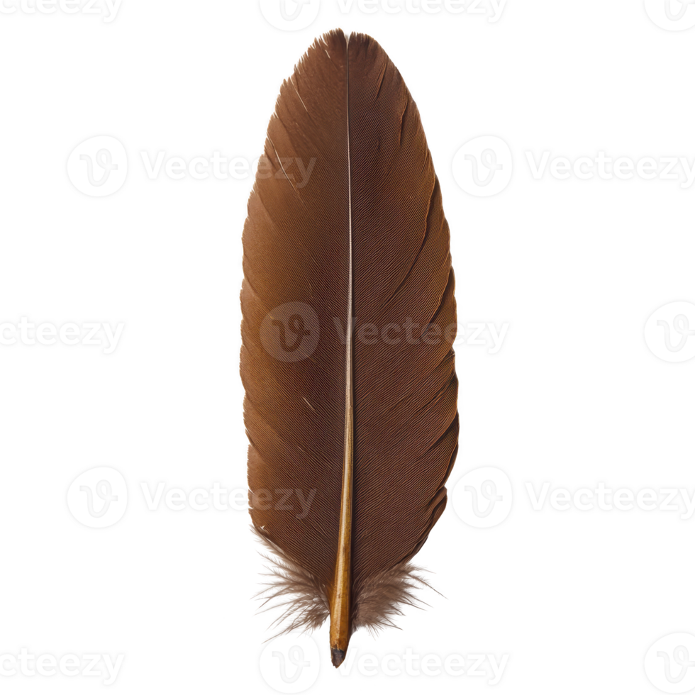 single brown feather with soft, delicate texture and slightly curved shape, isolated on transparency background. feather natural pattern and earthy tones create sense of elegance and simplicity Pro PNG