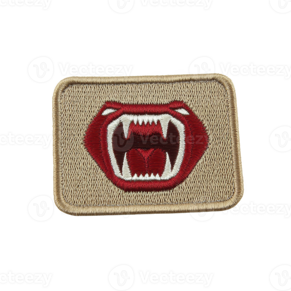 A This features rectangular embroidered patch with design of open mouth showing sharp fangs, set against beige background. patch has bold and striking appearance Pro PNG