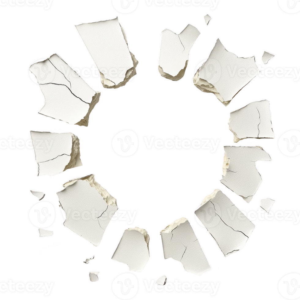 circular pattern of cracked and broken white plaster pieces creates dynamic and dramatic visual effect, suggesting impact or transformation. jagged edges and texture add depth and interest Pro PNG