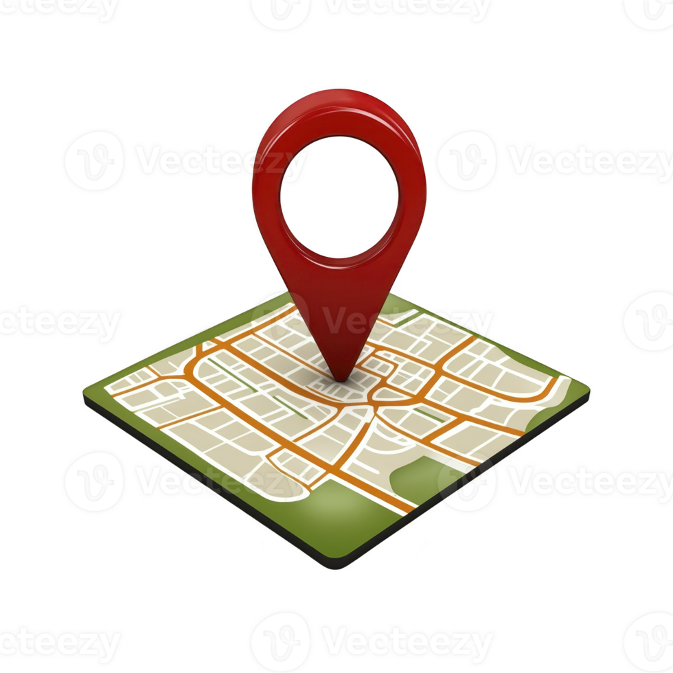 3D map illustration with red location pin marking spot on grid like street layout, symbolizing navigation and direction. map features roads and blocks, conveying sense of exploration Pro PNG