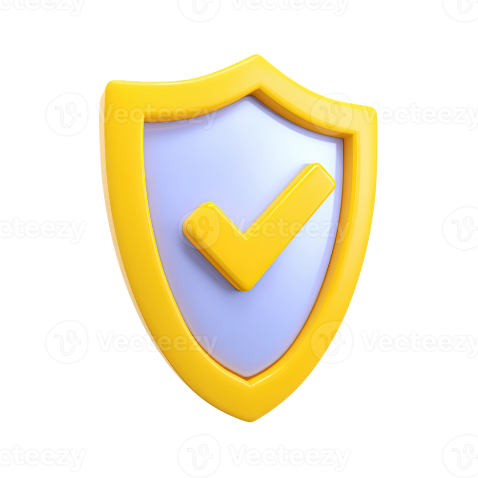 Yellow 3D shield with a white checkmark, symbolizing verification, approval, or safety confirmation. Isolated rendered graphic for security checks and positive validation concepts. Pro PNG