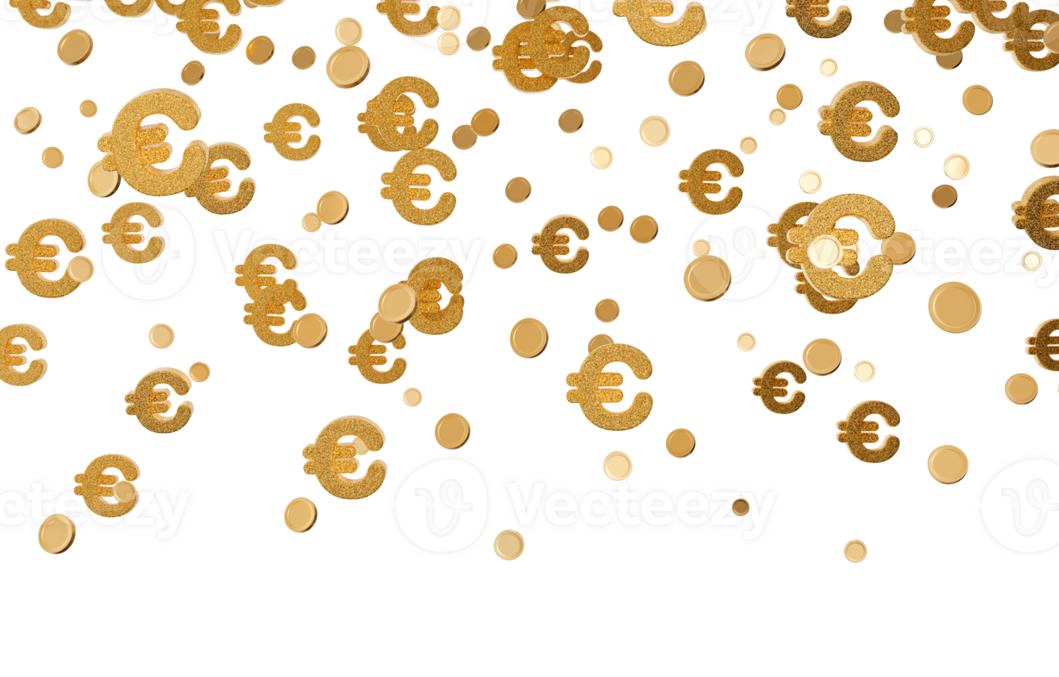 Euro signs in gold are falling downward, creating a dynamic visual effect suitable for financial presentations. The isolated design enhances the focus on currency and wealth. Header with euros. Pro PNG
