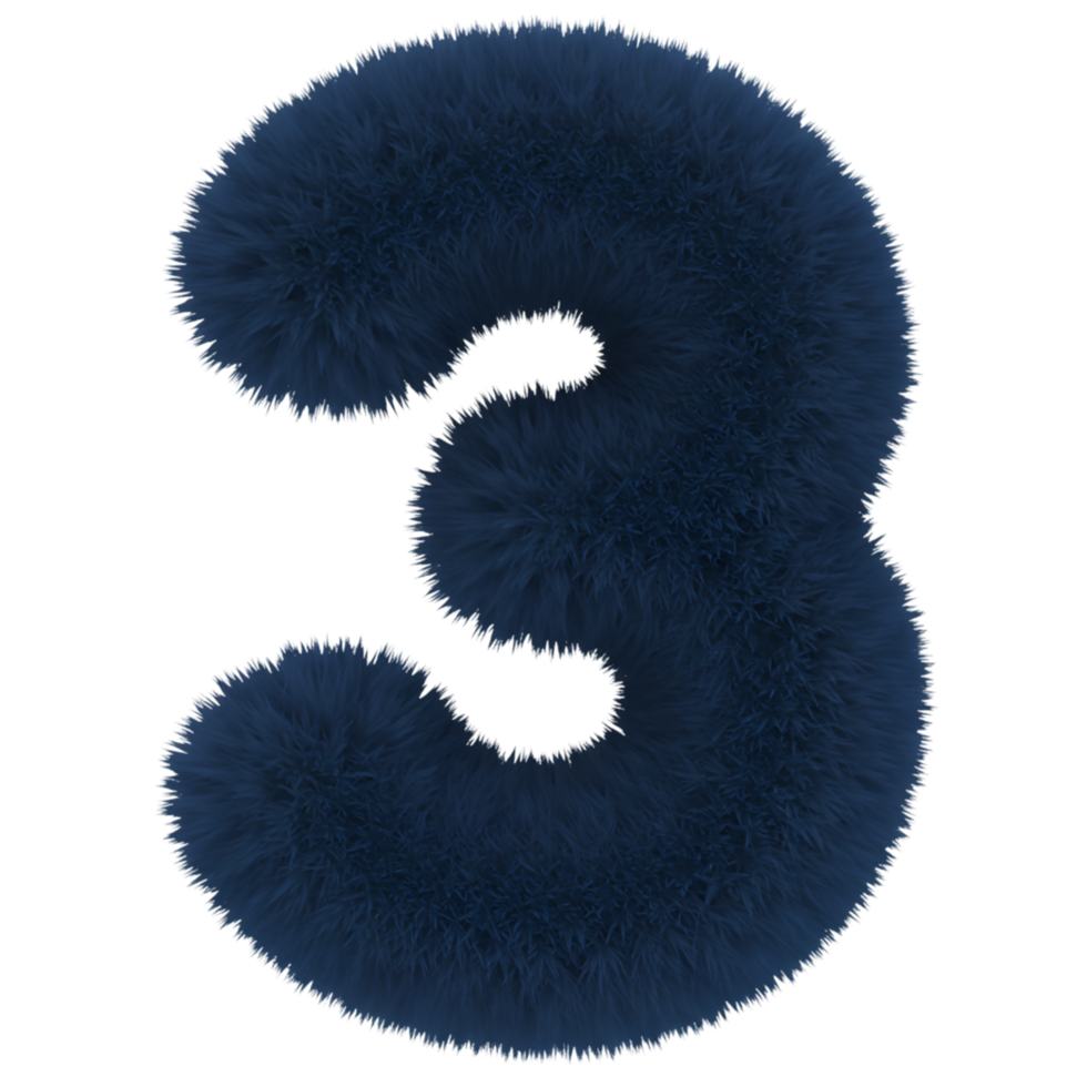 A fluffy navy blue number three against a plain setting adding a whimsical touch to typography art on transparent background png