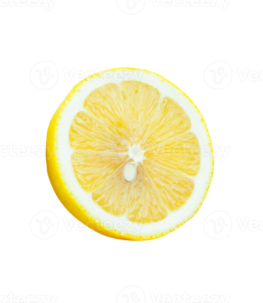 Front view of ripe yellow lemon fruit in one slice in circle with seed isolated with clipping path in file format Pro PNG
