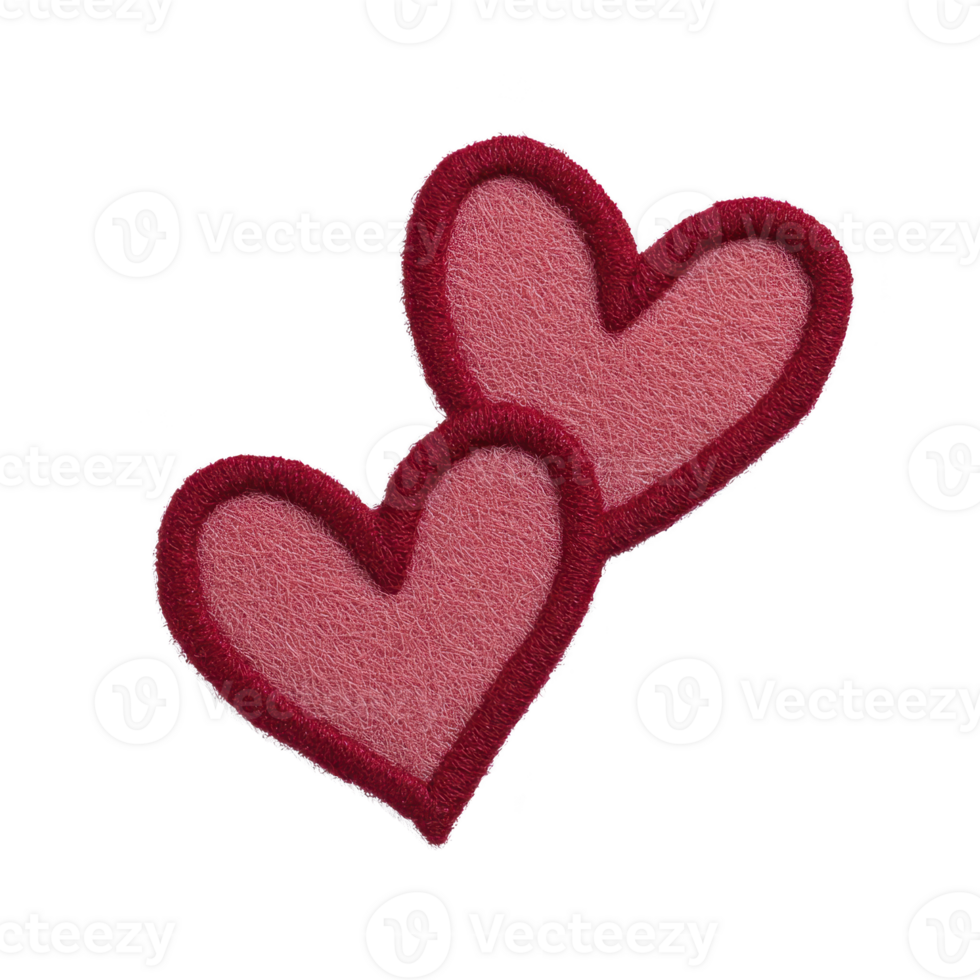 Two red embroidered heart patches with textured surface are overlapping, creating romantic and charming design. hearts have darker red border, adding depth and contrast Pro PNG