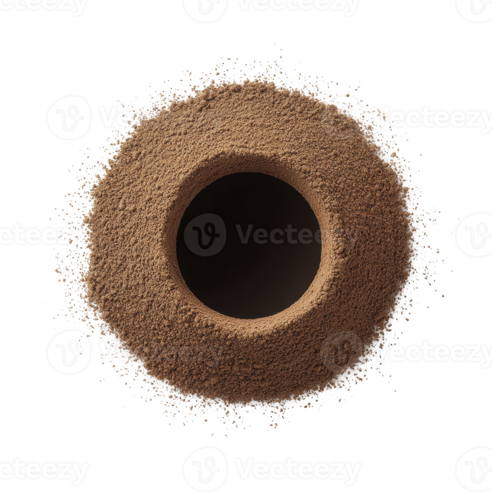 Circular mound of brown powder is surrounded by scattered dusting, creating textured and dynamic visual. central void adds depth and contrast to composition Pro PNG