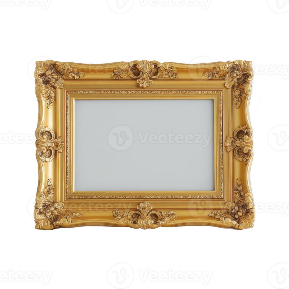 Ornate, empty gold picture frame with intricate floral designs and rectangular shape, set against plain background, exudes elegance and sophistication Pro PNG