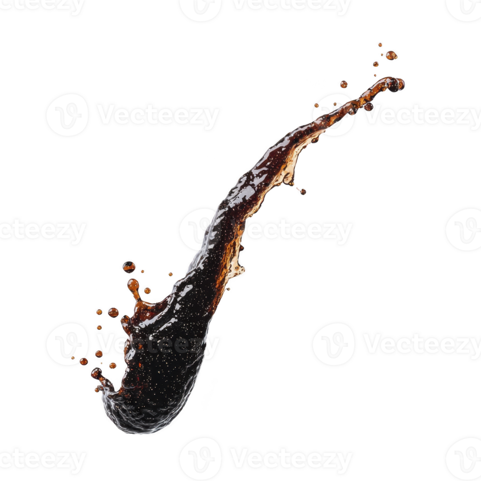 Dynamic splash of dark liquid arcs gracefully against transparency background, capturing motion and energy. droplets scatter, creating sense of fluidity and excitement Pro PNG