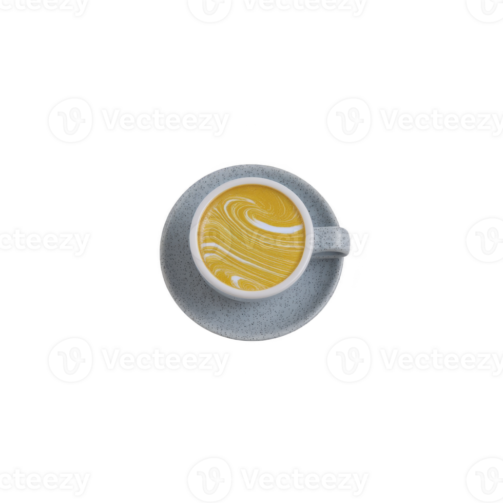 Top view of cup of golden turmeric latte with intricate latte art, set against transparency background. vibrant yellow color contrasts with speckled gray cup and saucer, creating visually Pro PNG
