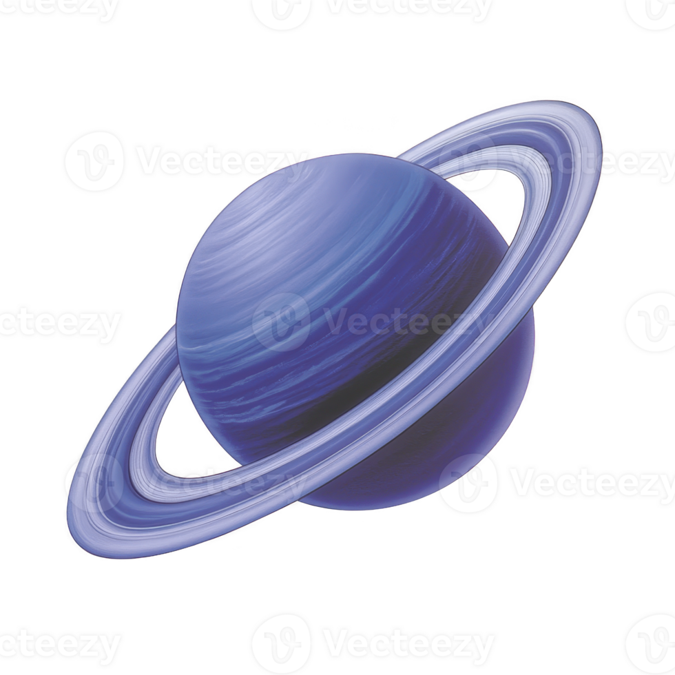 A digitally illustrated image of blue planet with prominent rings, resembling Saturn, floating in space. planet surface features swirling patterns, adding sense of motion and depth Pro PNG