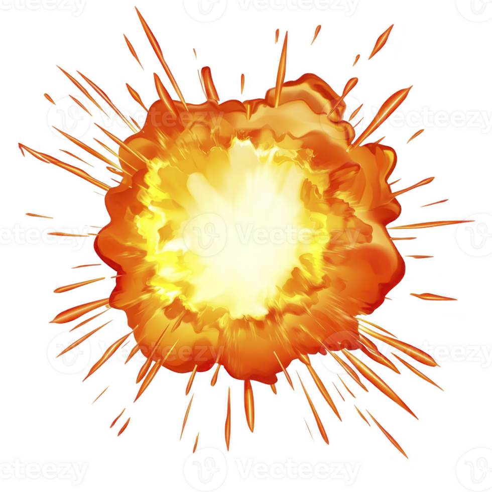 A vibrant explosion with fiery orange and yellow hues radiates outward, creating dynamic and intense visual effect. burst of energy is depicted with sharp, jagged edges and bright center Pro PNG