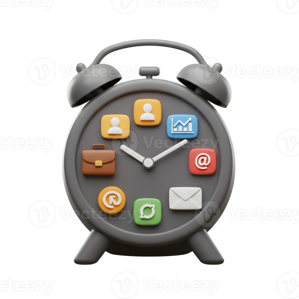 A gray alarm clock shows various application icons on its face, acting as a visual reminder for task management and scheduling. Pro PNG