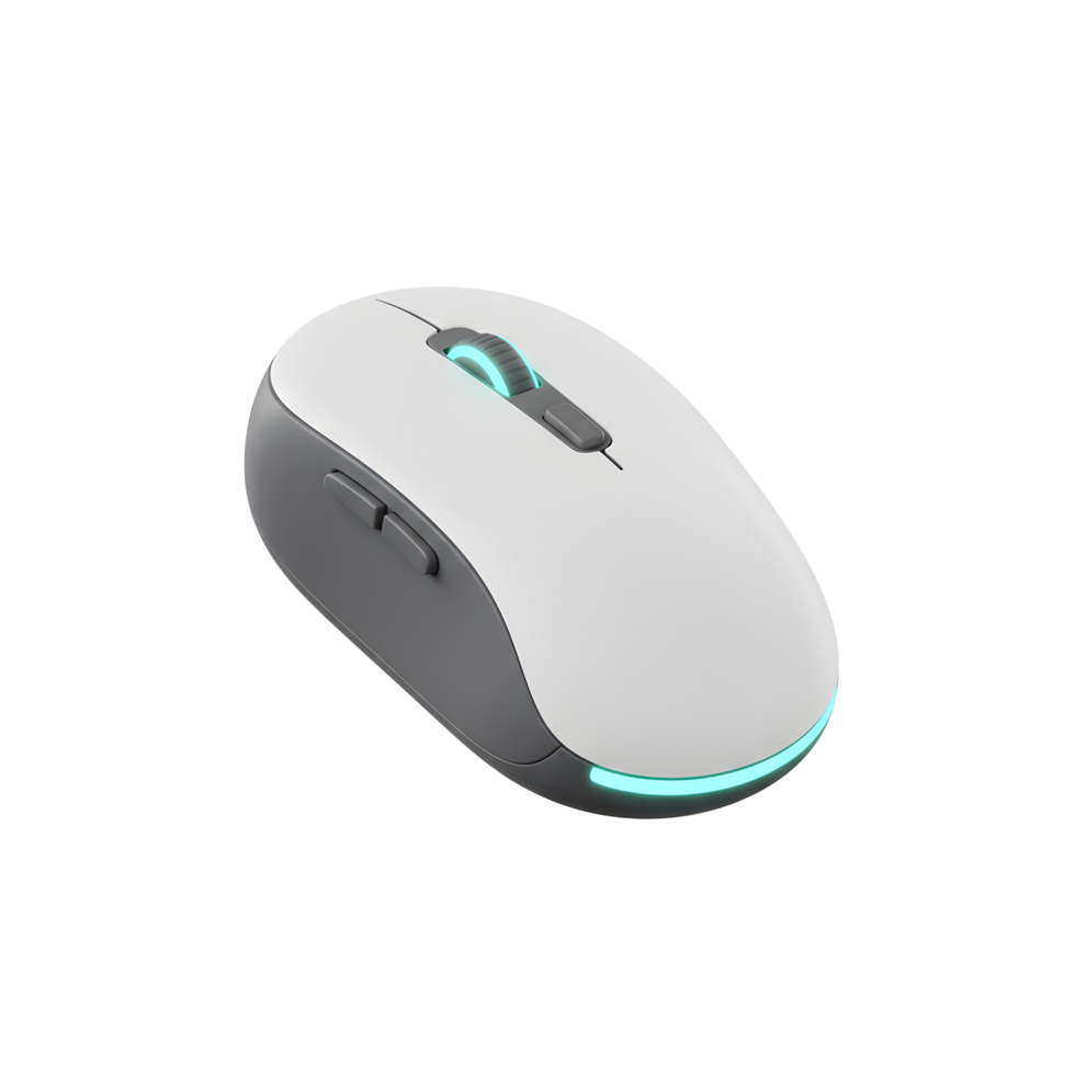 A white computer mouse with gray accents and a scrolling wheel is displayed, useful for navigating and controlling computer interfaces. Free PNG