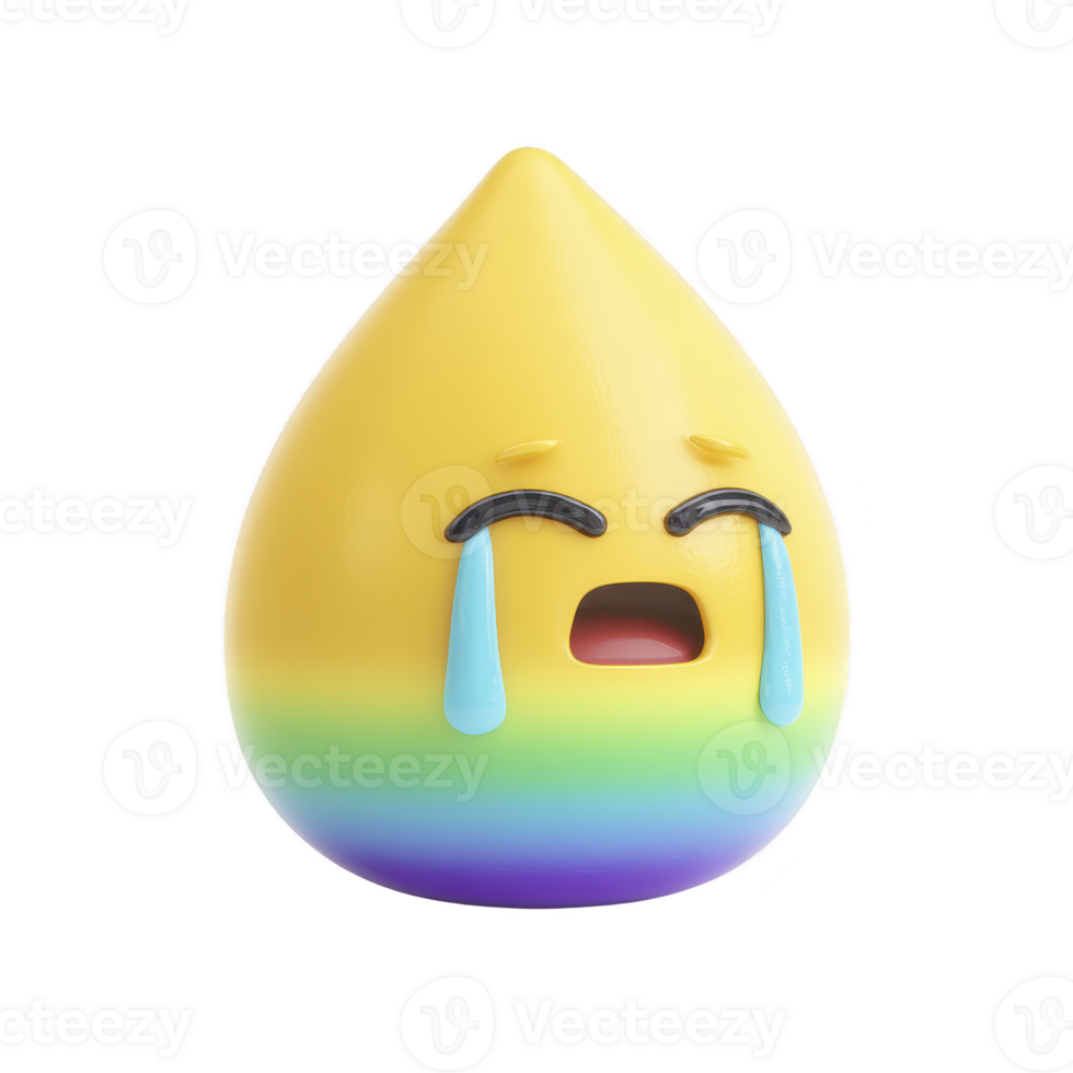 Teardrop shaped character with yellow top and rainbow base is crying with large tears. character has sad expression, featuring closed eyes and small open mouth Pro PNG