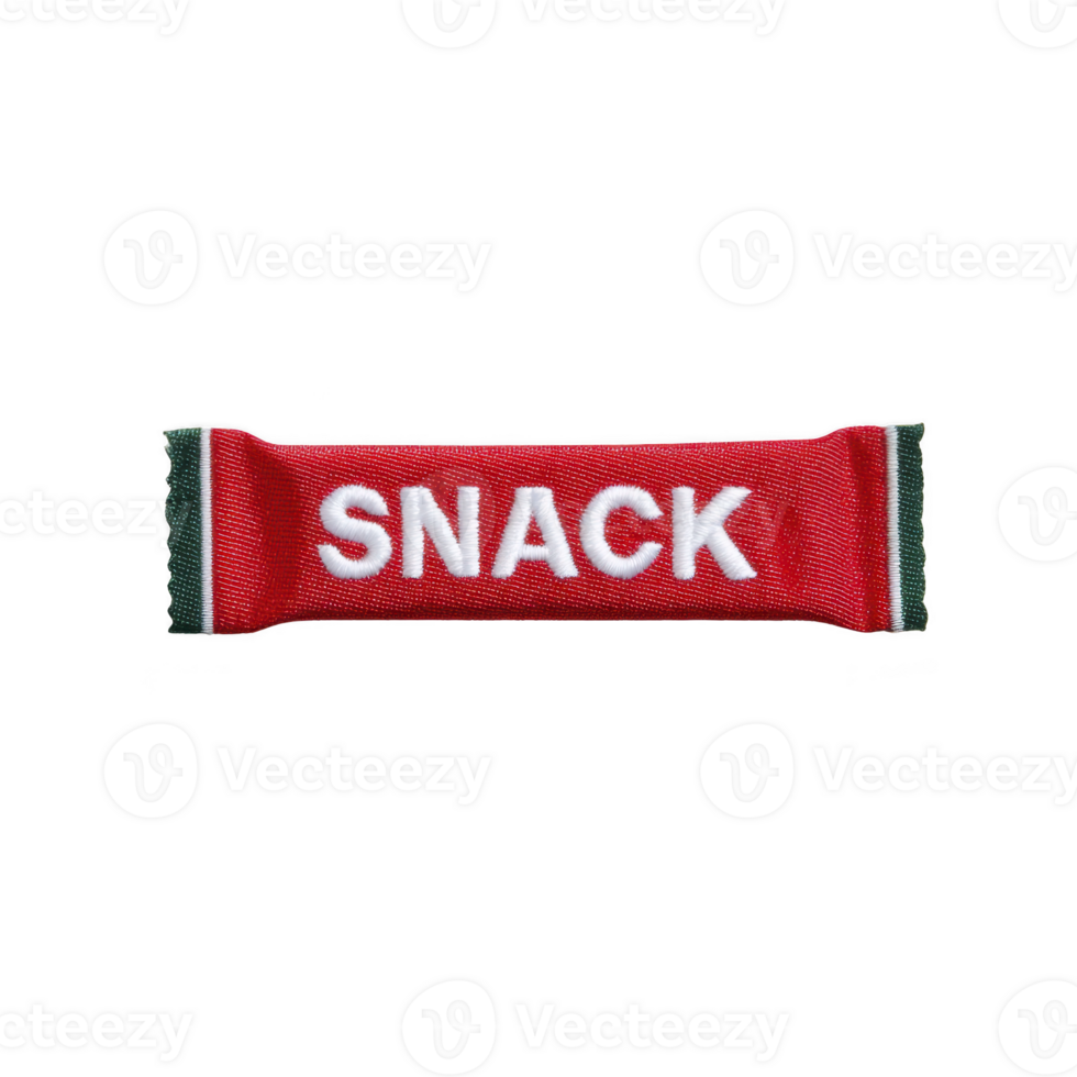 Red snack bar wrapper with bold white text displaying word SNACK is shown. wrapper has green accents on edges, giving it simple and appealing design Pro PNG