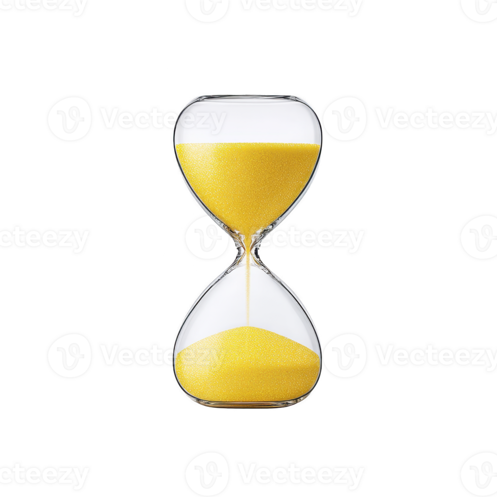 Clear hourglass with vibrant yellow sand flowing through it symbolizes passage of time. sand is evenly distributed between top and bottom chambers, creating sense of balance and continuity Pro PNG