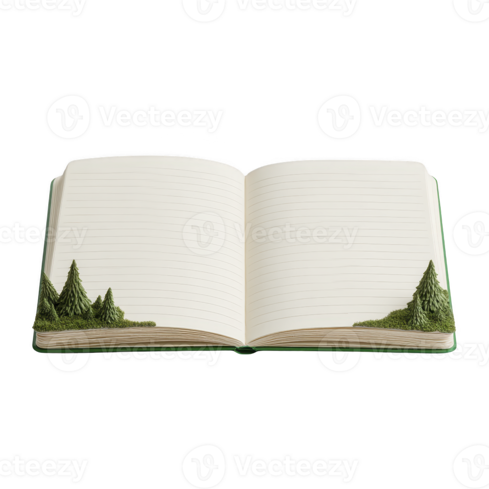 Open notebook with lined pages features unique design with small green trees at corners, creating nature inspired theme. notebook is open, inviting creativity and ideas Pro PNG
