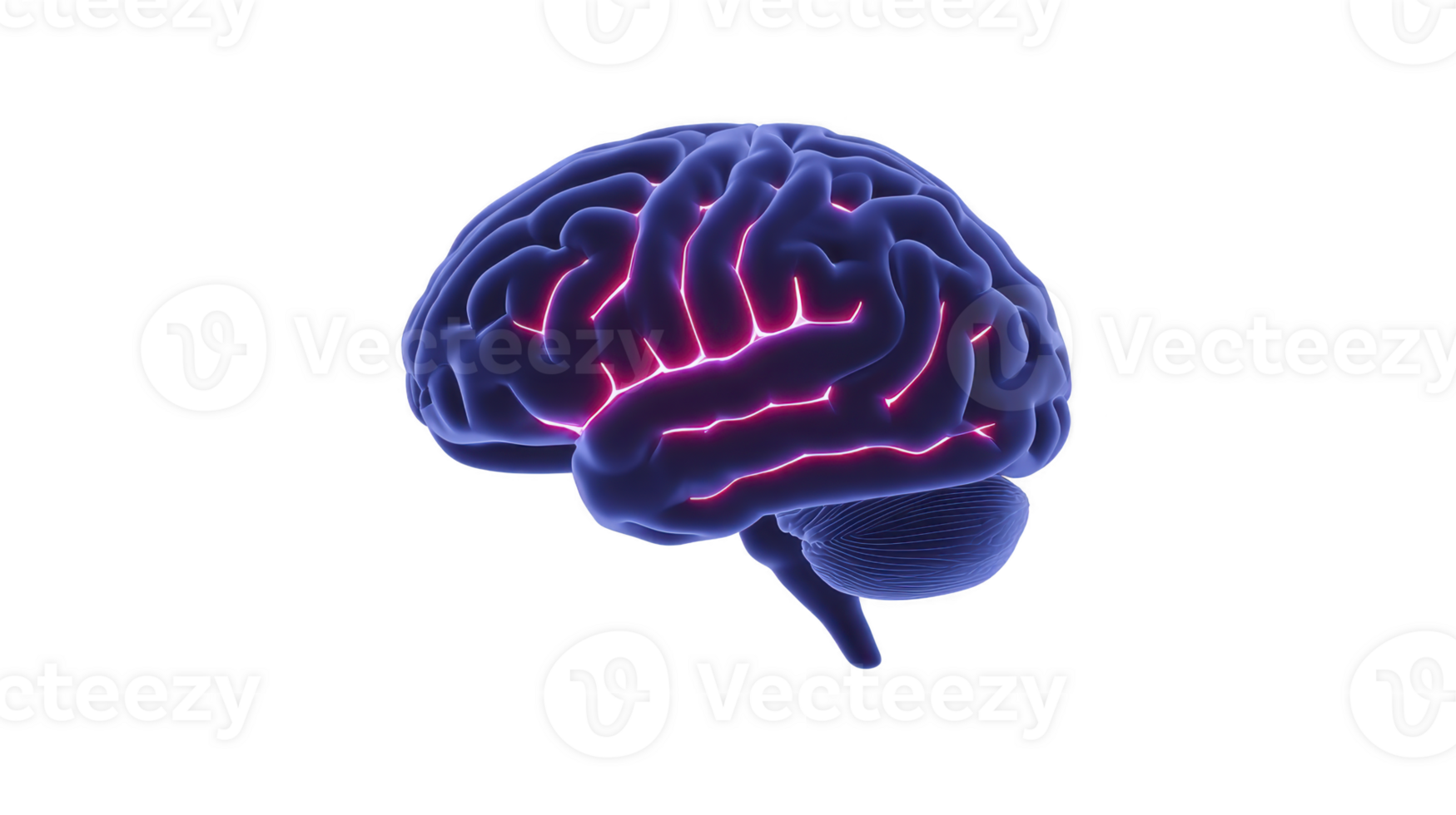 Glowing digital illustration of human brain with neon highlights, showcasing neural pathways and brain structure. image emphasizes complexity and intricacy of brain design Pro PNG
