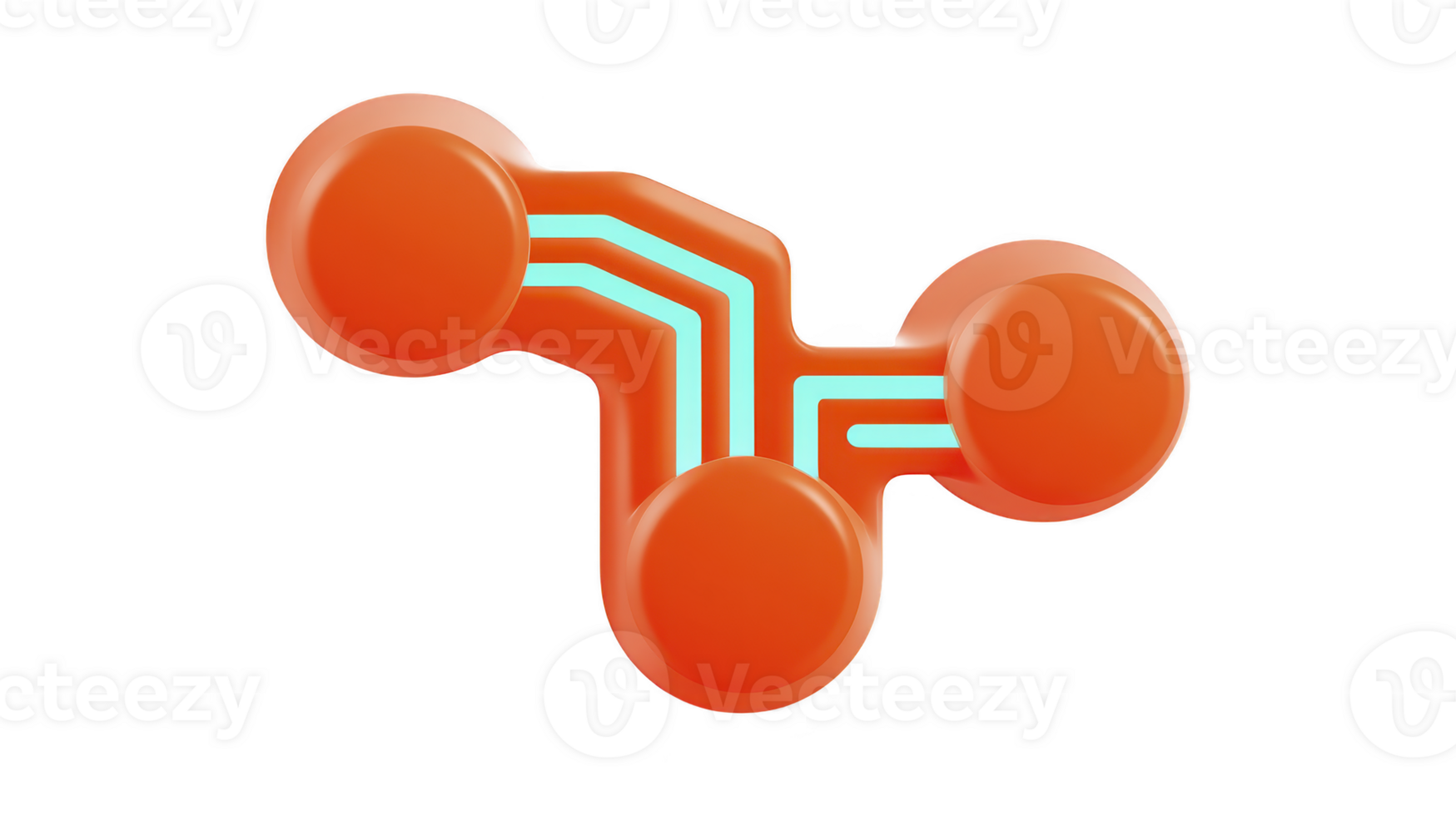 Abstract 3D illustration features bright orange shape with three circular nodes connected by glowing blue lines, creating futuristic and dynamic design Pro PNG