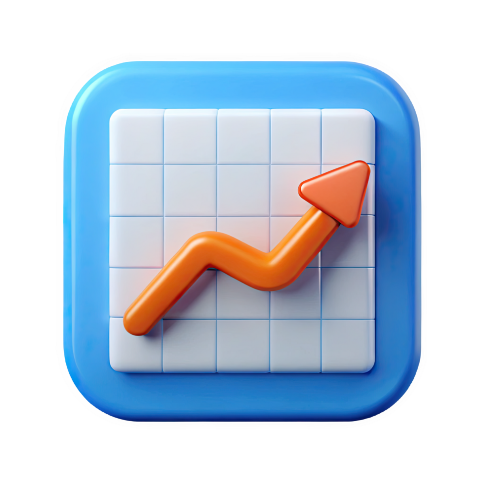 3 D Render of an Orange Line Graph Arrow Ascending on a White Grid within a Blue Square App Icon isolated on a transparent background Free PNG