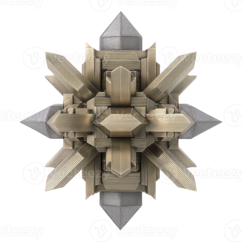 Geometric 3D sculpture with metallic and stone textures, featuring intricate symmetrical patterns and sharp angles, creating futuristic and artistic design Pro PNG