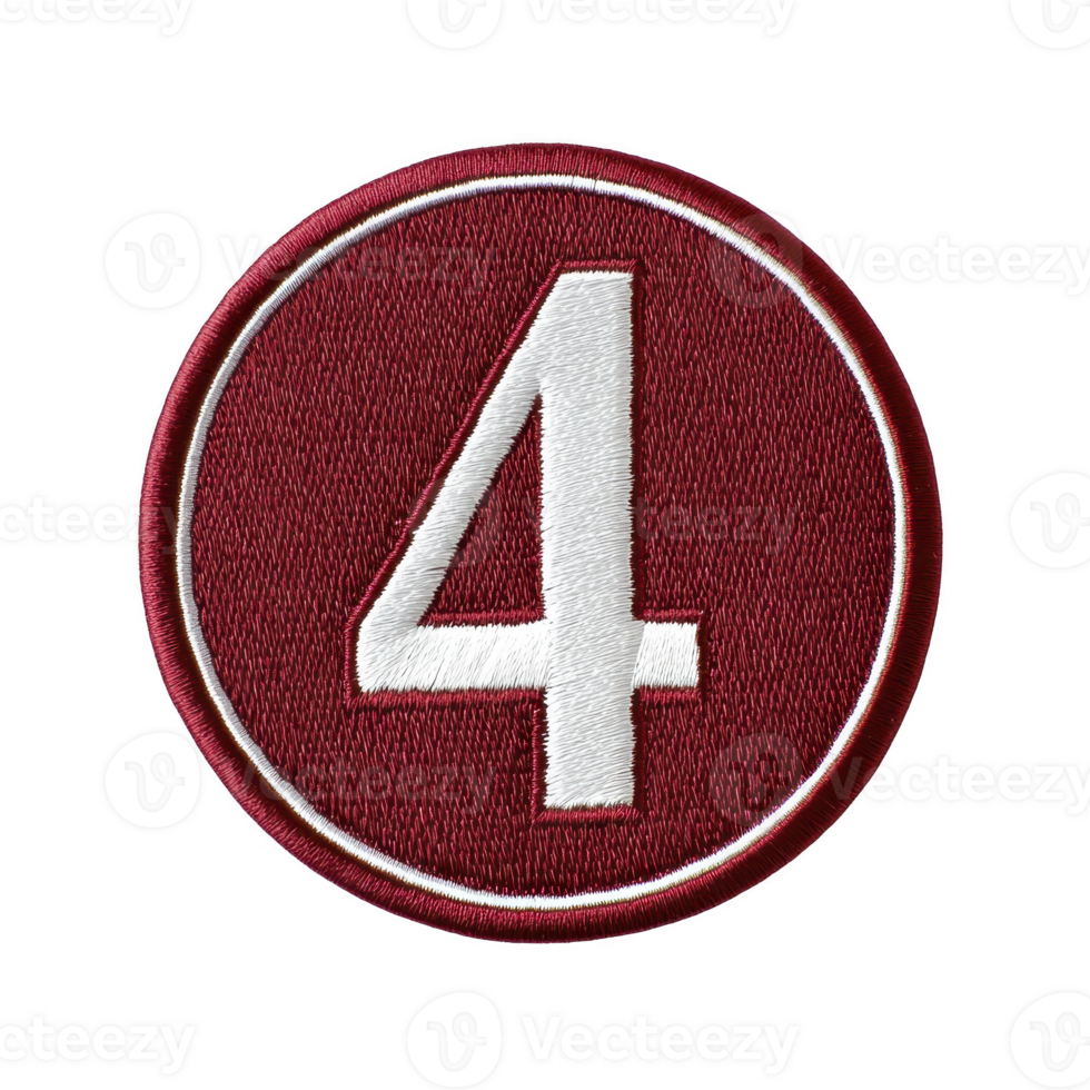 Circular embroidered patch features bold white number four on maroon background, outlined with white border. design is simple yet striking, suitable for various applications Pro PNG