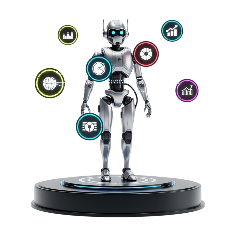 Futuristic humanoid robot with glowing circular icons representing data and technology floating around it isolated on transparent background png