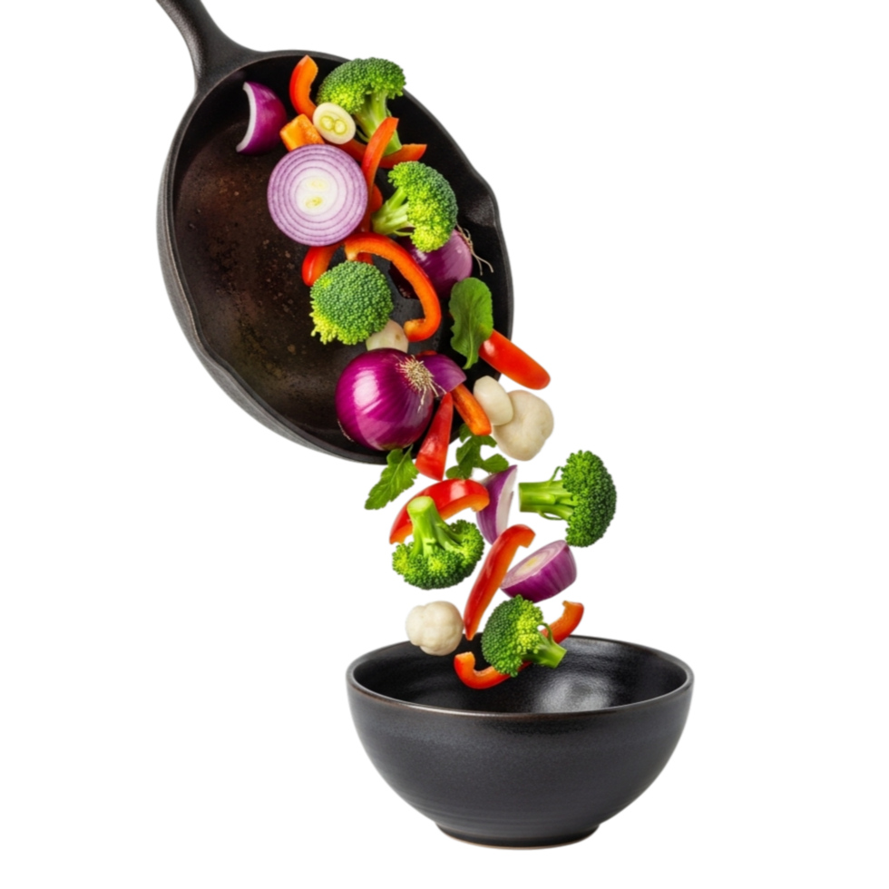 Fresh assorted vegetables tumbling from a wok into a bowl creating a dynamic culinary scene isolated on transparent background png
