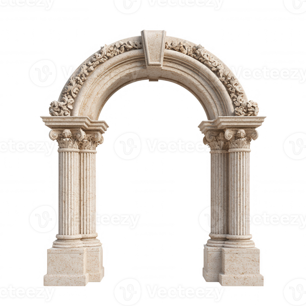 Classic architectural arch 3d icon featuring intricate floral carvings and supporting fluted columns, isolated on a designs background for easy integration into transparent Pro PNG