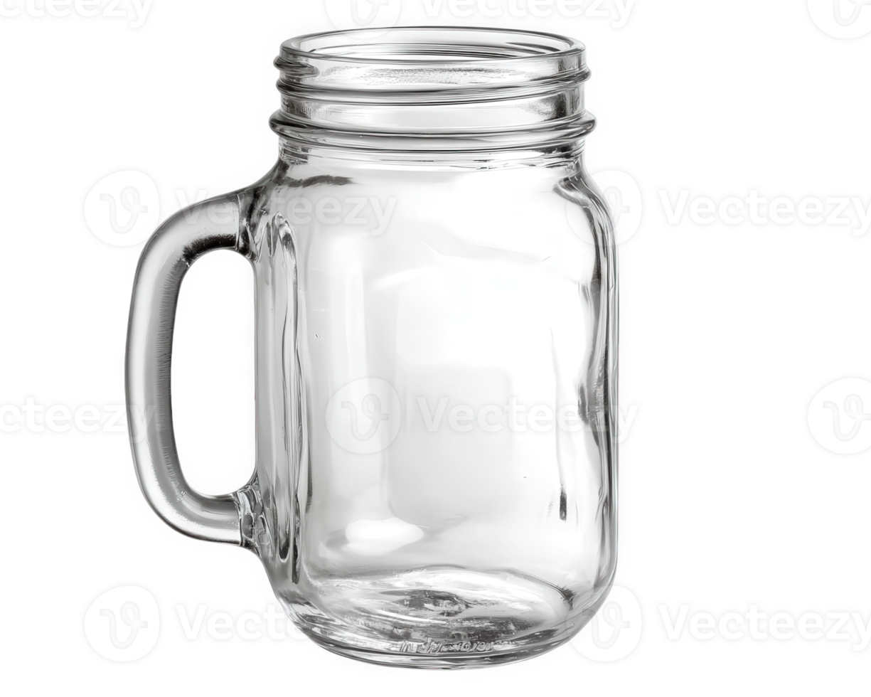 Clear glass mason jar with handle isolated on transparency background, perfect for beverages or storage, showcasing transparency and simple design with smooth surface and wide mouth Pro PNG