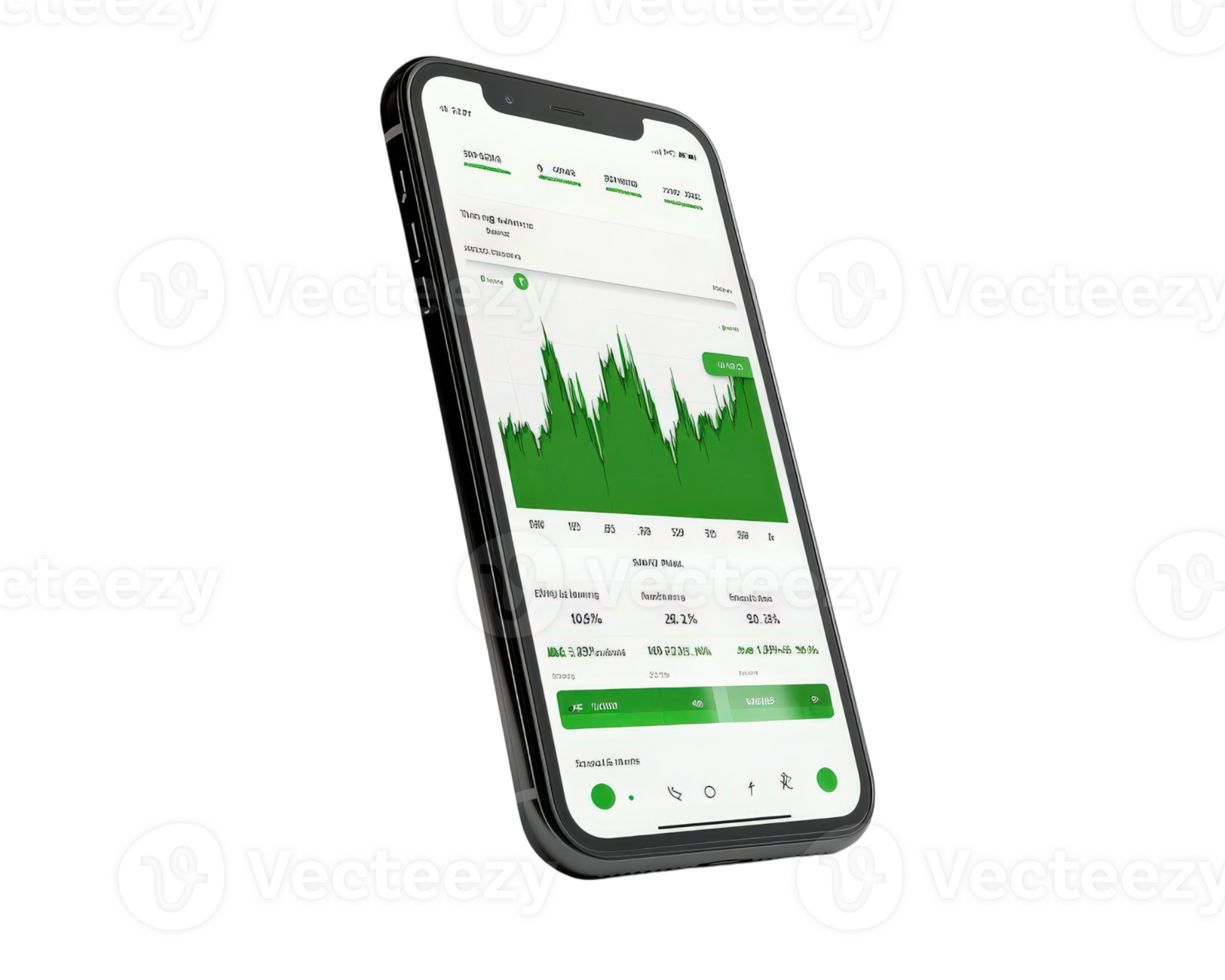 smartphone screen displaying stock market app with green graphs and data, indicating financial growth and trends. sleek design and interface suggest modern technology Pro PNG