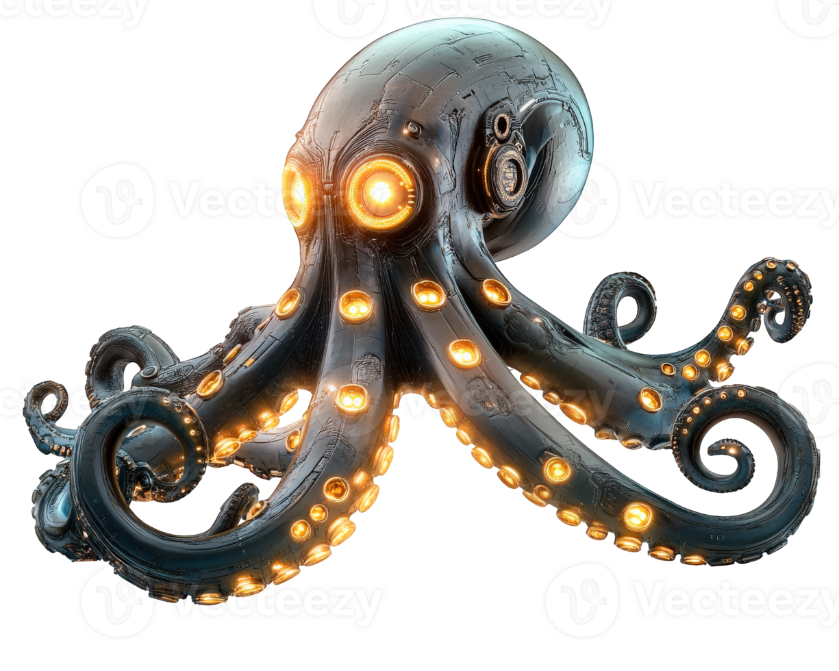 cybernetic octopus with glowing mechanical tentacles, showcasing blend of technology and marine life. Its intricate design and luminous features create captivating visual experience Pro PNG