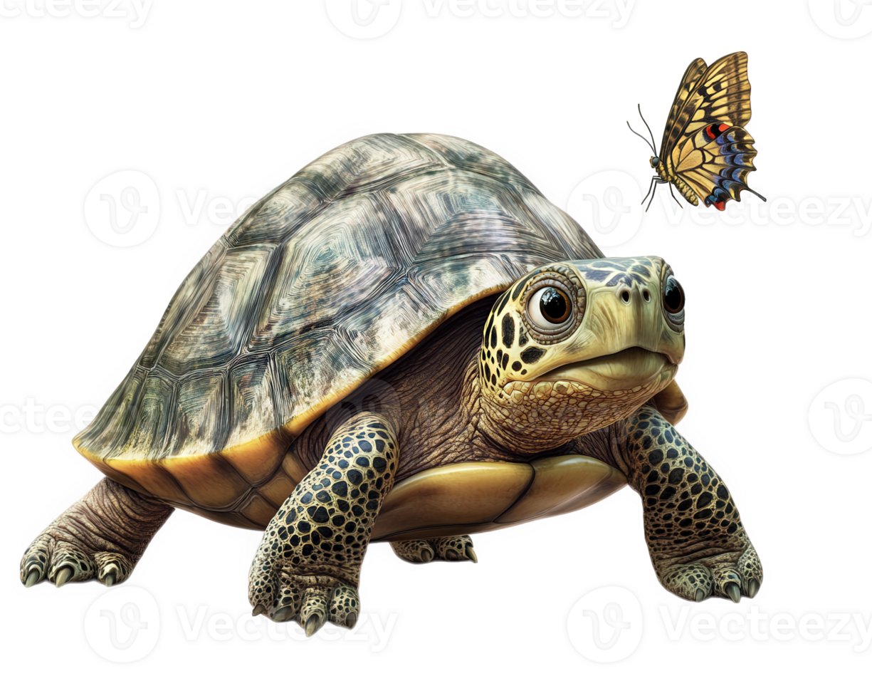 turtle with funny expression is trying to catch butterfly, showcasing playful interaction in nature. scene captures charm of wildlife and curiosity of animals Pro PNG