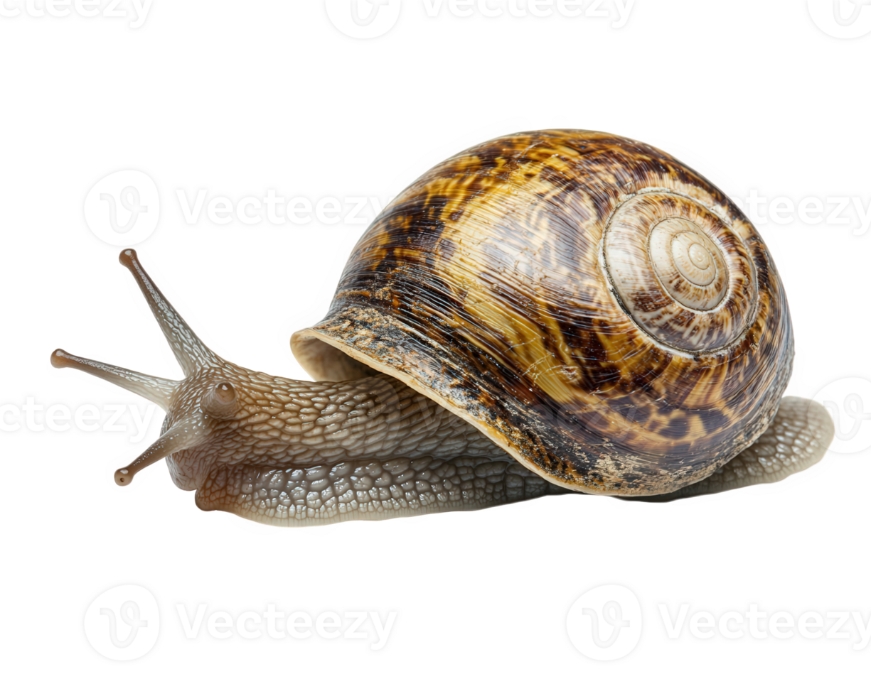 detailed close up of snail showcasing its spiral shell and soft body. snail is isolated on transparent background, highlighting its unique texture and colors Pro PNG