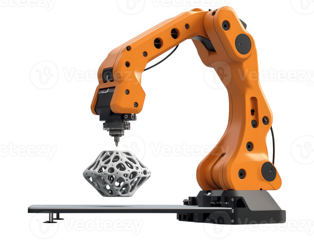 robotic arm assembling 3D printed object, showcasing advanced technology and precision in manufacturing. vibrant orange arm highlights innovation in automation and design Pro PNG