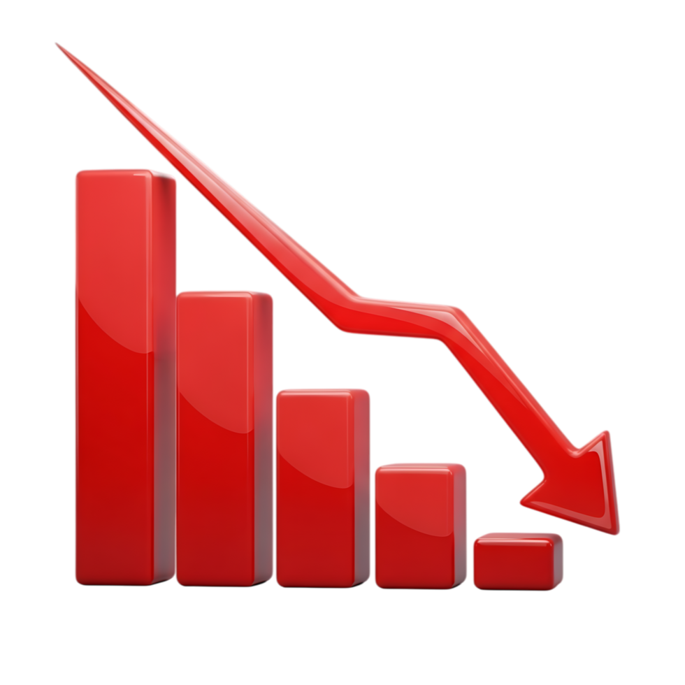 Red bar graph showing a sharp decline with a downward arrow isolated on transparent background png