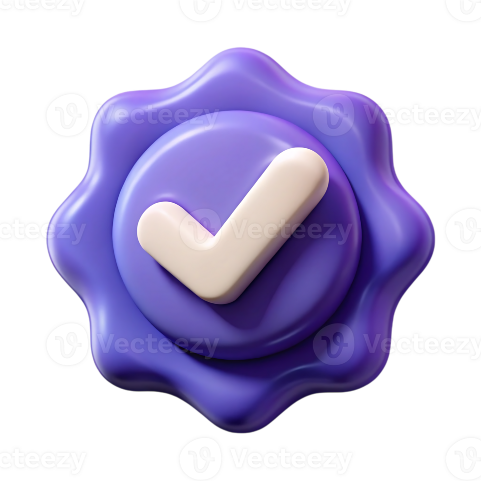 A 3d render of a purple badge with a white check mark isolated on transparent background, signifying verification, approval, and positive confirmation in a modern style Pro PNG
