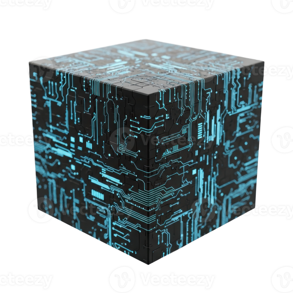 A black cube adorned with intricate, glowing blue circuit board patterns, representing technology, artificial intelligence, and digital concepts. Pro PNG