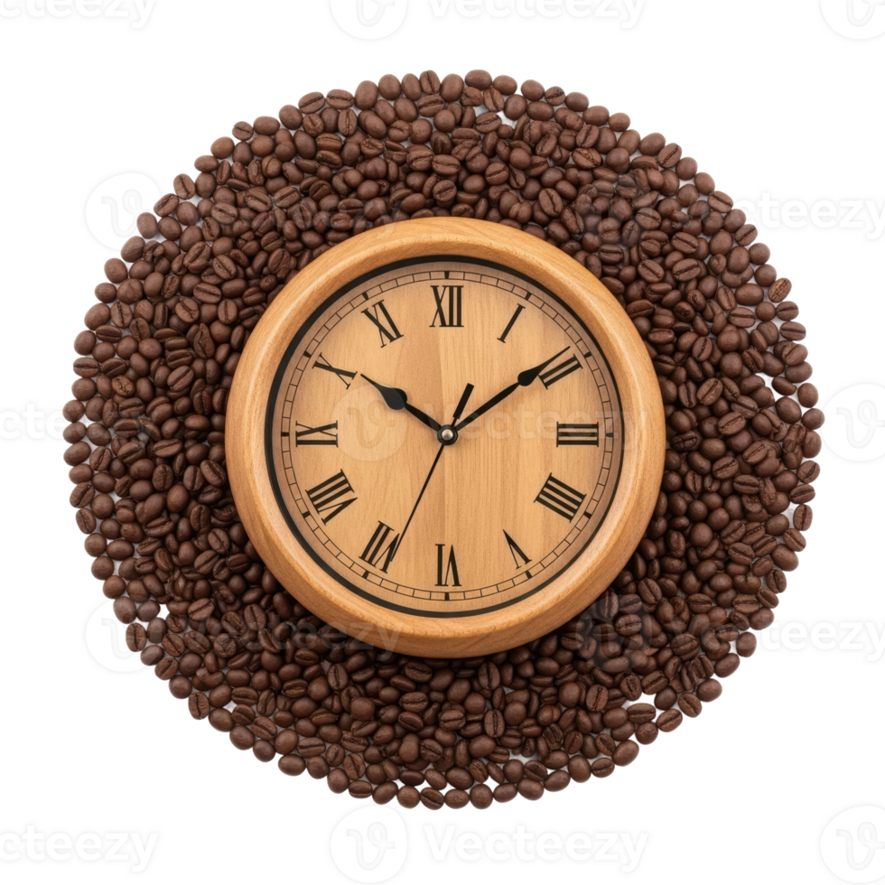 A classic wooden clock featuring roman numerals is centered within a circular frame of dark roasted coffee beans, creating a unique and aromatic time themed composition. Pro PNG