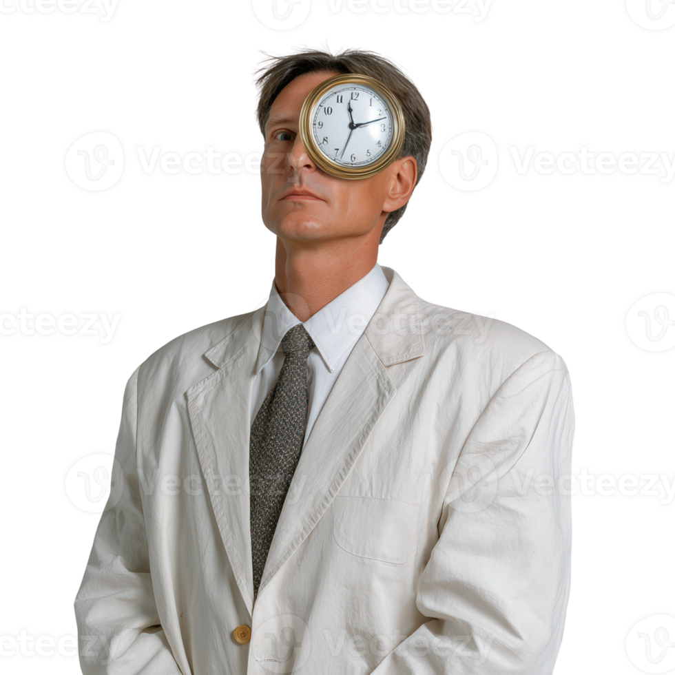 Conceptual Image of a Businessman with a Clock on His Face Representing Time Management and Pressure in Work Environment Pro PNG