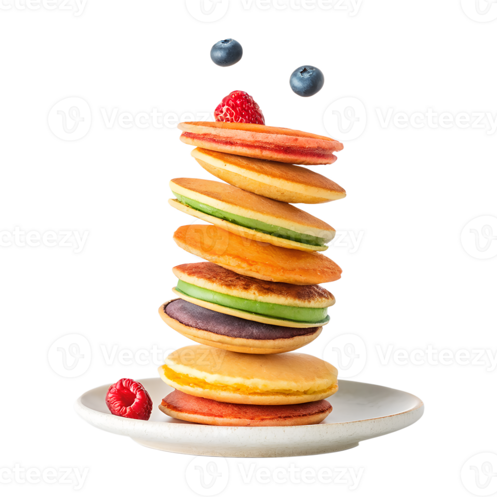 Stack of colorful pancakes with a raspberry on top and blueberries floating, on transparent background Pro PNG