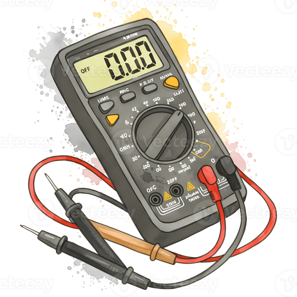 A digital multimeter with probes and a display showing zero reading in a watercolor style drawing art on transparent background Pro PNG
