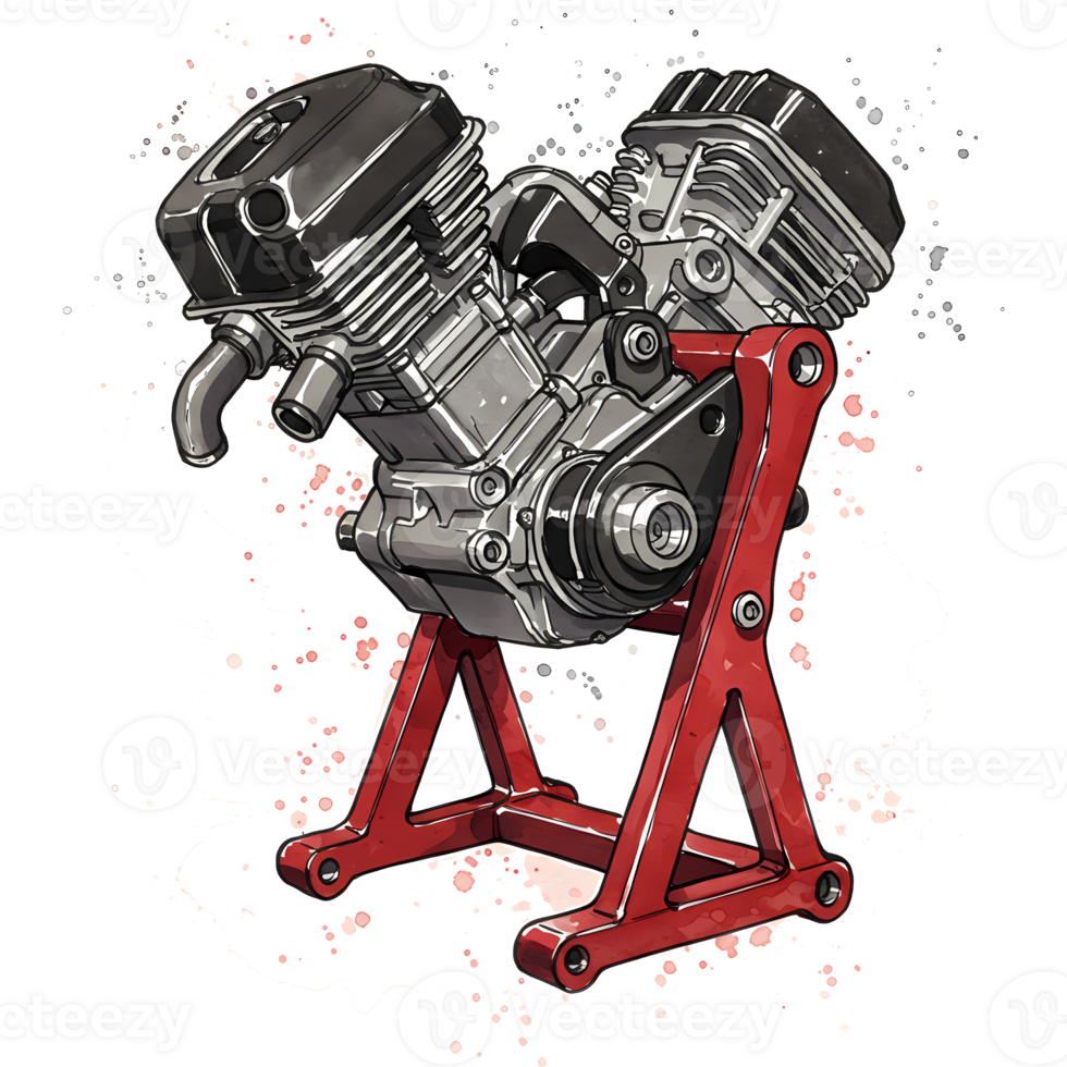 A detailed engine on a red stand with visible components and a stylized appearance in a drawing style on transparent background Pro PNG