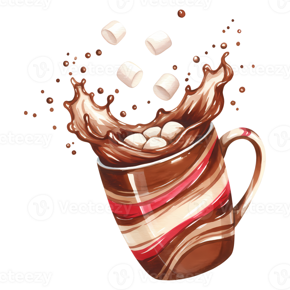 A mug of hot chocolate with marshmallows splashing out and floating around on a plain background on transparent background Pro PNG