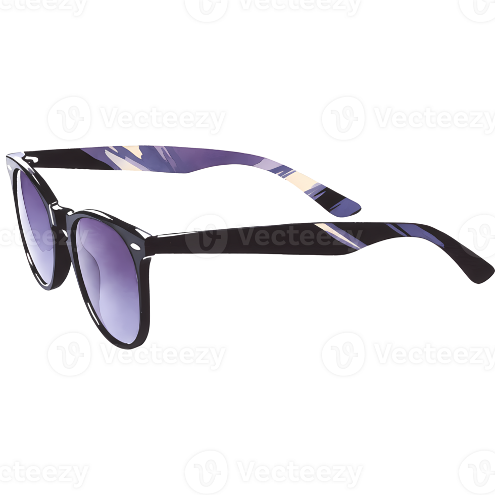A pair of eyewear with purple lenses and patterned arms displayed on a solid color setting view from side on transparent background Pro PNG