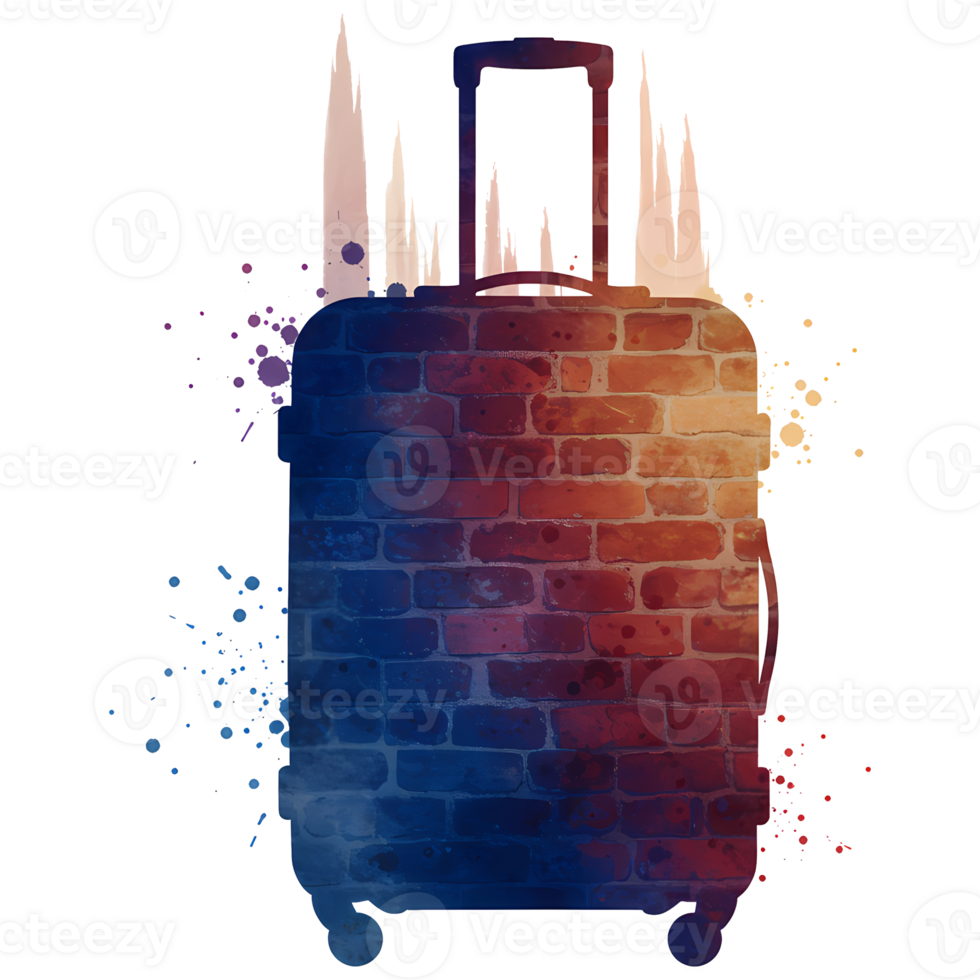 Suitcase with a brick texture and a handle against a plain backdrop with abstract shapes around it on transparent background Pro PNG