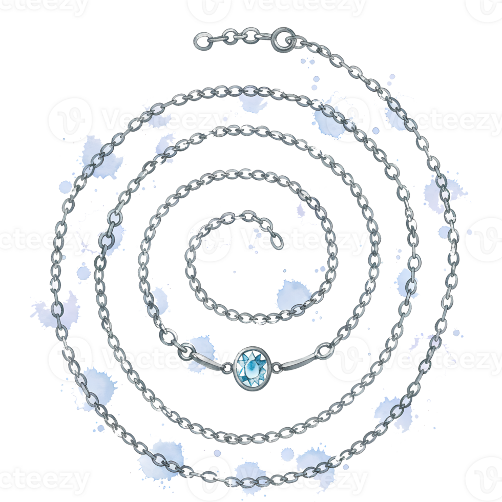 Silver chain with a blue gem pendant arranged in a spiral pattern on a plain surface view from above on transparent background Pro PNG