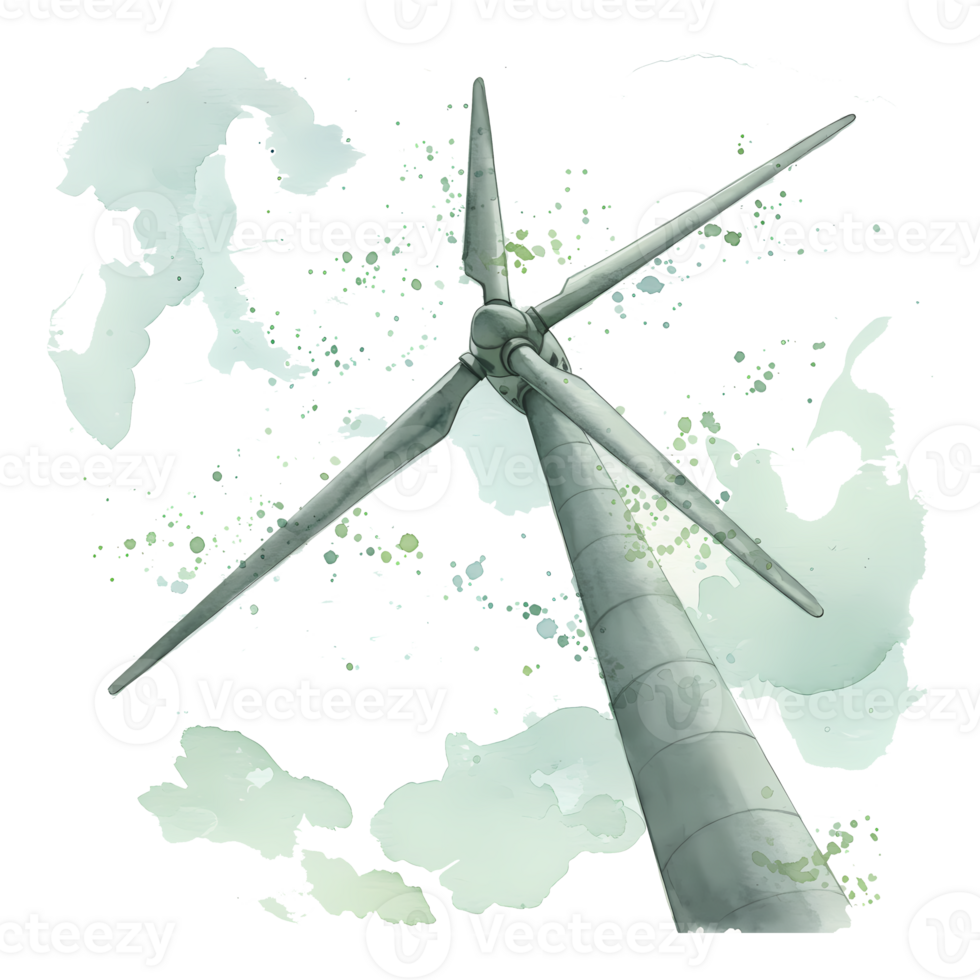 Low angle view of a wind turbine with three blades against a cloudy sky artistic rendering style on transparent background Pro PNG
