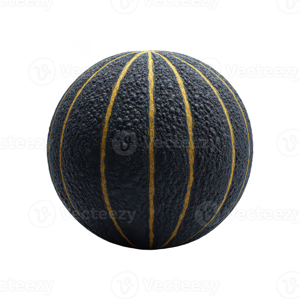 Black textured ball with yellow vertical stripes isolated on transparency background, showing rough surface and spherical shape with detailed lighting and shadow effects Pro PNG